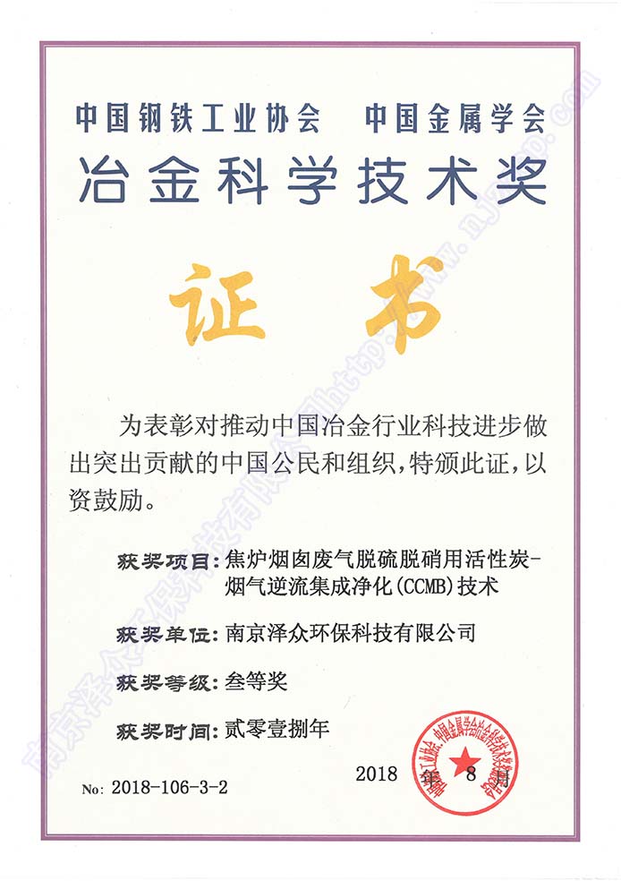 南京澤眾環保科技有限公司坐落于南京市雨花臺區,注冊資本6000萬元,2017年被認定為高新技術企業,2018年被認定為瞪羚企業,入選中國鋼鐵技術與服務供應商品牌企業,被評為鋼鐵產業鏈綠色標桿企業,與浙江工業大學合作成立聯合研發中心,入股河南安鋼澤眾冶金設計有限責任公司,牽頭起草《燒結煙氣活性焦干法脫硫、脫硝技術規范》和《焦爐煙氣聯合脫硫脫硝技術規范》。 公司專長于活性炭煙氣凈化技術,創新能力突出,成功研發具有獨立自主知識產權的活性炭-煙氣逆流集成凈化CCMB(ActivatedCarbon Countercurrent Moving Bed)技術,形成獨立自主知識產權體系,由中國金屬學會評價鑒定達到國際領先水平,獲得冶金科技三等獎,被評為“鋼鐵產業鏈綠色低碳好技術”,入選中國鋼鐵工業協會先進節能環保技術,入選生態環境部國家先進污染防治技術目錄推廣技術。